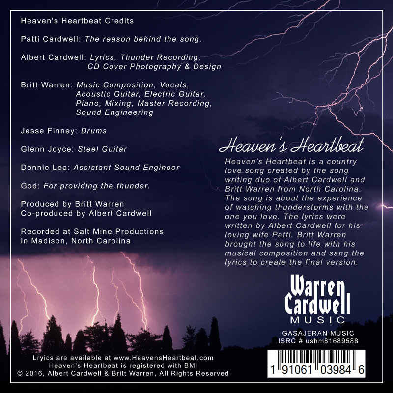 Heaven's Heartbeat is a country love song about the experience of watching a thunderstorm with the one you love. It was created by the song writing duo of Britt Warren and Albert Cardwell from North Carolina. Albert wrote the lyrics in the late 1990's for his loving wife Patti, because one of their favorite things to do was to watch thunderstorms together. After he wrote them, the lyrics stayed in a filing cabinet for over 17 years until Britt became part of the project. Britt has over 35 years of studio and recording experience as well as creating his own instrumental and multiple genre music that is known across the globe. Albert knew that Britt was the one to make the song happen. Britt created the musical composition and sang the lyrics to create the final version. In 2016 the song Heaven's Heartbeat became a reality.